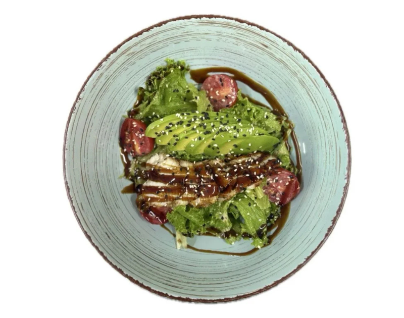 Склад: мікс салату, помідори чері, вугор, кунжут, авокадо, унагі, горіховий соус, олія соняшникова.